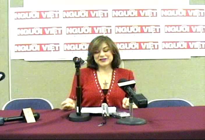 Dân Biểu Loretta Sanchez trong cuộc họp báo tại pḥng sinh hoạt Nhật Báo Người Việt. Bên cạnh là phụ tá của bà, ông Khôi Tạ.