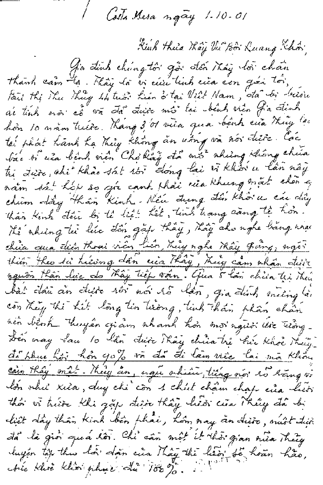 .” …Thầy cho nghe băng nhc cha bnh, và  qua đin thai vin liên, Thy cm nhn được ngun thn lc do Thy tiếp vn . Qua 5 ln cha tr Thy bt đầu ăn được ri nói rơ ln, gia đ́nh mừng lm, c̣n Thy th́ hết ḷng tin tưởng , tinh thn phn chn nên bnh thuuyên gim nhanh hơn mi người ước tưởng.