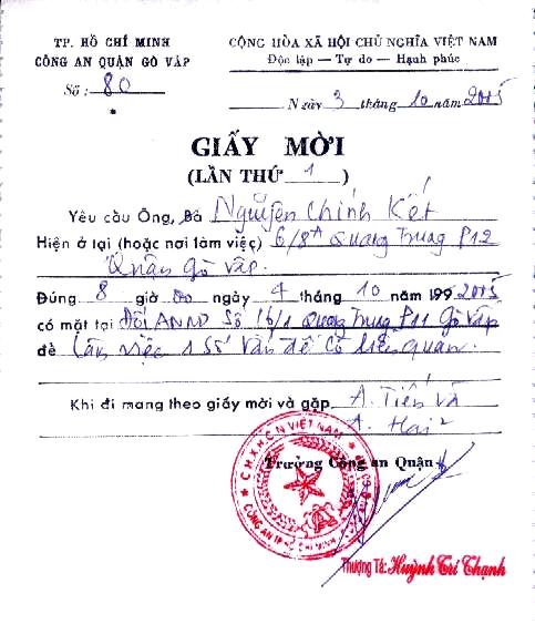 Letter to U.S. Consul General Seth D. Winnick San Jose, California October 3rd, 2005 Honorable Seth D. Winnick U.S. Consul General to Socialist Republic of Viet Nam 1 Le Duan Boulevard, District 1 Ho Chi Minh City, Viet Nam Re: Grave concern about safety of Professor Nguyen Chinh Ket, popular activist for Religious Freedom in Vietnam. Dear Consul General Winnick: It has been our grave concern about the safety of Professor Nguyen Chinh Ket, our popular activist for Religious Freedom in Vietnam. Unfortunately, this is the second time he has been invited to show up at Go Vap local police station "to work" with police officers after he had met with three other popular religious and/ or political dissidents to pay his friendly visit and exchange views on current social and religious issues in Vietnam. These three dissidents whom Professor Nguyen had met on September 27, 2005 were Catholic Reverend Thaddeus Nguyen Van Ly (a popular conscience prisoner who was just released from prison a few months ago), Professor Tran Khue and Engineer Phuong Nam Do Nam Hai. The visit was at Professor Tran Khue's residence when Professor Nguyen Chinh Ket and Reverend Thaddeus Nguyen Van Ly met at Tan Son Nhat International Airport to say goodbye to Father Nguyen's nephews and nieces on their departures to the United States to be resettled as political refugees after years of imprisonment by Vietnamese authorities. Professor Nguyen is an instructor who has taught Philosophy and Theology at a number of major Catholic seminaries. He also has authored numerous articles regarding his quest for Religious Freedom in Vietnam. He is also our great personal friend and a highly dedicated father of a Catholic family who always dreams of a free, modernized and humanized Vietnam where he, his family and 80 million Vietnamese belong. We earnestly request that you immediately intervene in this threatening incident to stop the police at Go Vap station and also the police in Ho Chi Minh City not to bother Professor Nguyen Chinh Ket and his family any more. Certainly, We are strongly convinced that a casual meeting to say hello and exchange views about issues of participants’ beloved country in a friendly atmosphere of a social get-together is not something very important that a legitimate government should be so afraid of and eventually make fun of itself to the whole world. Respectfully yours, Viet Si Activist for proven Democracy and Religious Freedom in Vietnam Former Prisoner of Conscience in Vietnam San Jose, California Cc: Honorable Michael W. Marine U.S. Ambassador to Socialist Republic of Vietnam Attachment (Second police warrant issued to Professor Nguyen Chinh Ket)