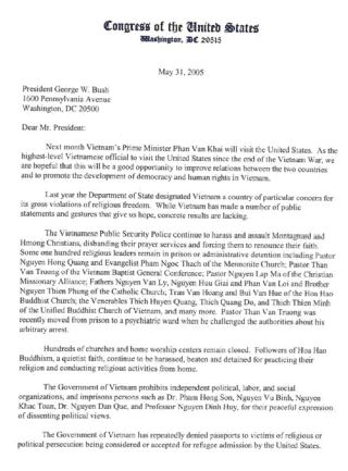 thư này mang chữ kư của 43 vị dân cử, vừa được phổ biến ngày 6-6-2005 và