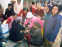 H́nh trái: Các bà mẹ Công giáo đang mặc áo lại cho chị Thu Hà và tất cả kéo
