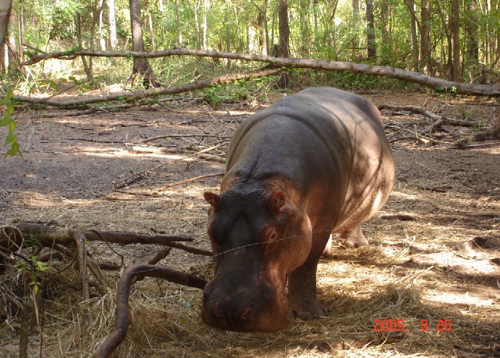 Today Owen was resting out on the ground with Mzee and relaxing in the puddles and mud. Not much was happening, and the whole forest was still as it usually becomes after it rains. Owen is definitely getting bigger by the day. Male hippos tend to be bigger than the female hippos. When looking at him and at Cleo (Cleo was pictured 06/10/05) it becomes easier to imagine that one day he may be as big as, or even bigger than Cleo. I really hope that they will get on.