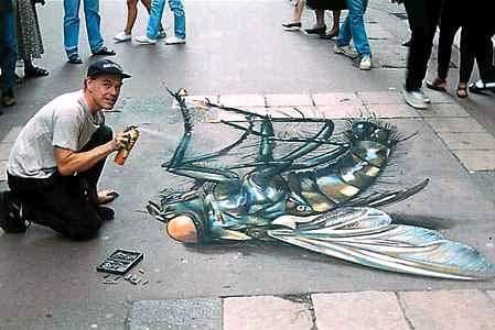 Đây là những bức vẽ trên vỉa hè . Bề mặt vỉa hè phẳng ngang, những bức vẽ trông giống như cao lên khỏi mặt đất, hoặc thụt sâu xuống.