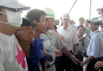 Một ngư dân (áo xanh) đã không thể đứng vững sau những ngày trôi dạt giữa biển.