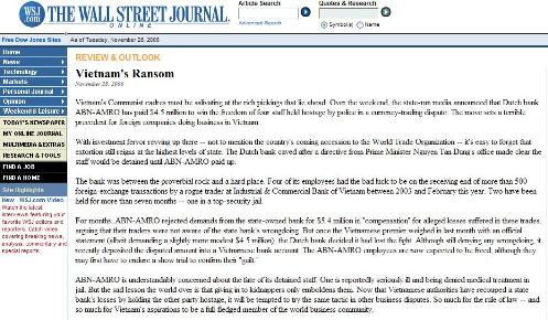 Sự kiện xãy là vào cuối tuần qua khi ngân hàng Hoà Lan ABN-AMRO đã đồng ý trả số tiền $4.5 triệu Mỹ Kim để cứu 4 nhân viên của ngân hàng khỏi bị tiếp tục giam cầm trong vụ tranh chấp vế vấn đề buôn bán ngoại tệ giữa ngân hàng ABN-AMRO và ngân hàng quốc doanh Công Thương.Tưởng cũng nên nhắc rằng tờ báo The Wall Street Journal là một tờ báo chính trỊ và kinh tế đứng hàng đầu của Hoa Kỳ. Tờ báo này là cha đẻ của các tờ báo như The Asian Wall Street Journal, The South China Morning Post, The Asia Times, The Far Eastern Economic Review.... Tờ The Wall Street Journal cũng trực thuộc thị trường chứng khoán Hoa Kỳ.