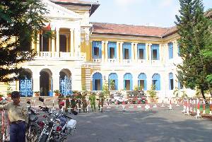 thường. Có các hàng rào màu trắng-đỏ chận ngang trước cổng chính vào ṭa án, và