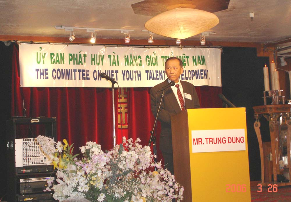 Chúng tôi cần nhấn mạnh rằng trong trường hợp này tại Hoa Kỳ, tài chánh không phải là vấn đề khó khăn, là trở ngại cho việc tiến thân theo hướng đó. Để khuyến khích thanh niên sinh viên Việt theo đuổi mục tiêu trên, Ủy Ban sẽ mời kỹ thuật gia Dung Trung, một thanh niên Việt thành công vượt bực đến nói chuyện cho họ nghe. Anh Dung Trung khi sang Hoa Kỳ tị nạn vào năm 1985, và sau một thời gian phấn đấu gian khổ đã thành công trên đường học vấn, rồi cũng thành công trong phát minh vể điện toán. Anh bán công ty với một giá là 1 tỉ 800 triệu MK. Anh là gương sáng cho họ noi theo. Đây là buổi nói chuyện đầu tiên trong dự án này. Một dàn nhân sự trẻ ưu tú của hàng ngũ tị nạn là những kỹ thuật gia hay khoa học gia trong nhiều ngành, đang làm việc cho các cơ quan công hay tư, tại xứ này sẽ sẵn sàng tiếp tay vào công tác có lý tưởng cao cả này. Đây là một công tác dài hạn mà kết quả chỉ có thể thấy được trong dài hạn, có thể hàng chục năm về sau.