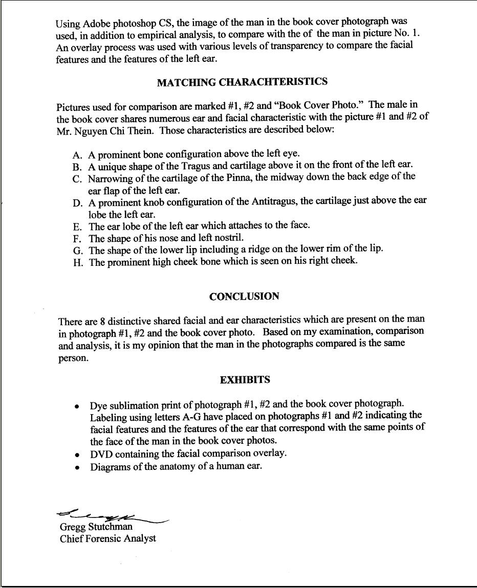 Đây là một đoạn trích trong bản báo cáo ngày 29 tháng Sáu năm 2006 của Stutchman Laboratory: "Những bức hình đã được máy điện toán của phòng thí nghiệm dùng software về hình ảnh mở ra để quan sát ... Phòng thí nghiệm này thường xuyên giảo nghiệm những bức hình chụp từ những máy quay phim video dùng để bảo vệ những hiện trường xảy ra những tội phạm, cốt để phân tích và nhận diện những đặc tính cá nhân để có thể xác nhận hoặc loại trừ một nghi can. Dùng cùng một phương pháp như vậy mà chúng tôi đã làm trong các trường hợp kể trên, chúng tôi dùng để phân tích và so sánh gương mặt và những đường nét khác của người đàn ông trong những tấm hình nói trên ... Người đàn ông trong bức hình bìa sách [Hoa Địa Ngục ấn bản 1996] đã có 8 đặc điểm nét mặt và tai giống y như người đàn ông trong hai tấm hình #1 va` #2. Dụa trên sự quan sát của tôi, sau khi so sánh và phân tích, tôi cho rằng người đàn ông trong 3 bức hình kể trên cùng là một người". Ký tên: Gregg Stutchman, Trưởng nhóm Giảo Nghiệm