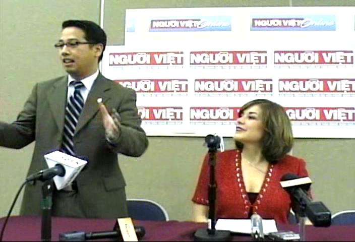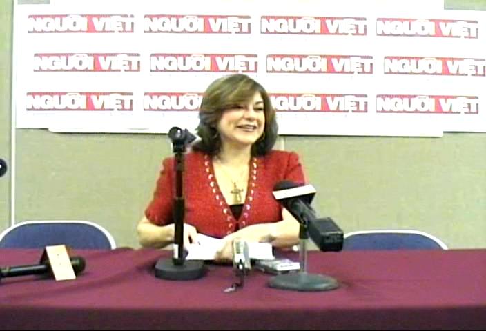 Dân Biểu Loretta Sanchez trong cuộc họp báo tại pḥng sinh hoạt Nhật Báo Người Việt. Bên cạnh là phụ tá của bà, ông Khôi Tạ.