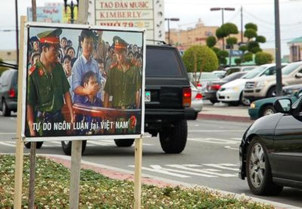 Trong hình là bức hình lịch sử trong phiên tòa xử Linh Mục Nguyễn Văn Lý ngày 30 Tháng Ba 2007, tại Huế. Trong hình, Linh Mục Lý ngồi giữa hai cảnh sát và bị một nhân viên an ninh mặc thường phục bịt miệng sau khi hô “Ðả đảo Cộng Sản” ngay tại phiên tòa. Bức hình đã gây phẫn nộ trên toàn thế giới, đặc biệt là đối với cộng đồng Việt Nam hải ngoại. Một số đồng hương trong nhóm anh em thường uống cà phê tại quán Croissant Doré, trên đường Bolsa, Westminster, đã in lại tấm hình và cắm ngay trước Thương Xá Phước Lộc Thọ. Ðược biết, nhóm này cũng cắm một số hình như vậy tại nhiều địa điểm khác trong khu vực Little Saigon. (Hình: Thanh Nguyên/Người Việt).