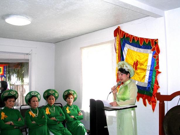 Cấp thứ hai là tượng ảnh Đức Thánh Trần, có hai chân đèn luôn cháy sáng. Cấp thứ ba có hai bài vị bằng chử Việt ngữ, bên trái là Anh Thư Việt Chi Vị và bên phải là Anh Hùng Việt Chi Vị. Đĩnh đồng to lớn, hai chân đèn và lư hương đồng có khắc lưỡng long chầu nguyệt được lau chùi bóng nháng. Lễ vật của ngày giổ Tổ truyền thống là cặp bánh chưng to, hai đĩa bánh dầy tròn trịa trắng phao, hai con heo quay được bày hai bên, sôi màu, sôi trắng, một mâm thạch lớn hình tròn mùi thơm phức, trang trí rất đẹp với hàng chữ theo vòng tròn Lễ Giỗ Tổ Hùng Vương - Hội Phụ Nữ VN Tacoma; thật nhiều trái cây đủ loại trên hai mâm lớn và hoa đẹp đử màu. Hai chậu bông đại thọ màu vàng nổi bật trước bàn thờ .