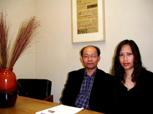 | Linh Mục Nguyễn Văn Hùng, và cô Vân Lê khi thăm Việt Báo, mời đồng hương dự Đêm Nhân Quyền cuối tuần này để hiểu rơ về hoàn cảnh công nhân và cô dâu Việt bị ngược đăi ở Đá Loan. |