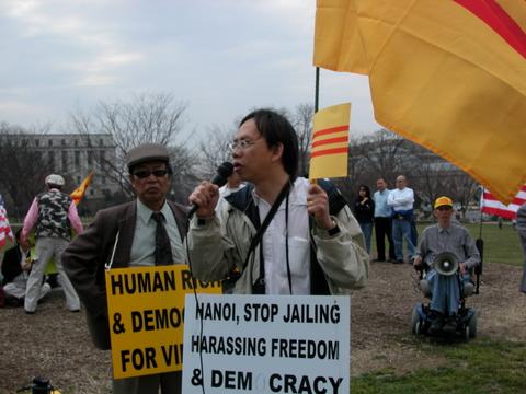 Luật sư Trần Văn Hiệp, Chủ Tịch Trung Tâm VN Về Nhân Quyền VN ở Pháp , trên 80 tuổi đă từ Pháp, không ngại  sức khỏe, đường xá xa xôi, đến Hoa Kỳ để dự cuộc biểu t́nh, được mời lên phát biểu. Ông Hiệp nói, ” tôi tới đây để tố cáo Chính quyền Hà Nội không thể dùng những thủ đoạn gian dối , dùng luật pháp một cách lừa bịp để đàn áp đồng bào chúng ta tranh đấu ôn ḥa trong nước, không cho họ quyền bào chữa như luật quốc tế. Chúng tôi sẽ tố cáo trước dư luận quốc tế Hà Nội đă dùng luật tố tụng để  bắt giam ít nhất là 16 tháng không xét xử . Đó là một sự vi phạm trắng trợn luật quốc tế về nhân quyền mà VC đă tham gia từ 1982.