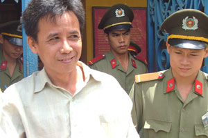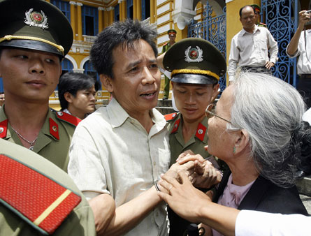 Le Nguyen Sang (2nd L) and Nguyen Bac Truyen (2nd R) leave a court in Ho Chi Minh City May 10, 2007. A court in communist-run Vietnam sentenced three people to between three to five years in prison on Thursday in the first of three trials of political activists in May. Defendant Le Nguyen Sang, 48, a doctor, was sentenced to five years imprisonment at the close of the four-hour long trial. Businessman Truyen, 39, was sentenced to four years and businessman Huynh Nguyen Dao, 39, to three years. REUTERS/Kham (VIETNAM)