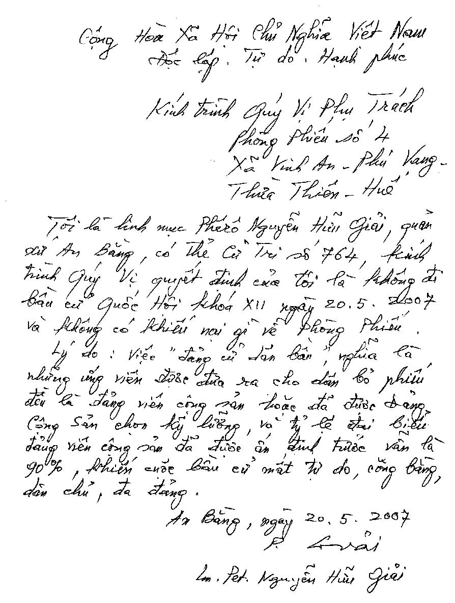 Kính thưa Quư vị,Giờ phút này, tṛ hề bầu cử đang xảy ra tại VN. Hầu hết toàn dân đều bị buộc phải tham gia cái tṛ phản dân chủ đầy tính cưỡng bức và lường gạt này. Tuy nhiên vẫn có những con người cương quyết chống lại, theo tiếng lương tâm của ḿnh. Chúng tôi xin gởi tới Quư vị 3 Lời tuyên bố về bầu cử của ba nhà đấu tranh quốc nội (xin xem attachment). Xin cảm ơn Quư vị