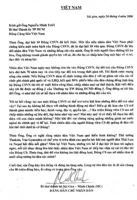 Tôi đánh cuộc mạng sống ḿnh: Nếu Đảng CSVN dám tổ chức một cuộc trưng cầu dân ư dưới sự giám sát của các tổ chức phi chánh phủ quốc tế và LHQ, và nếu số phiếu vượt quá 50% sự đồng t́nh của dân chúng ủng hộ Đảng CSVN th́ tôi sẽ xuất hiện công khai, chấp nhận mọi sự thử thách.