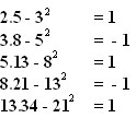 Một sự trùng hợp tự nhiên nữa là nếu ta lấy ba số liên tiếp trong số liệt số Fibonacci rồi lấy tích số của hai số đầu và cuối rồi trừ đi bình phương của số ở giữa thì sẽ được +1 hay -1. Tỷ dụ theo số liệt đã viết ở trên, ta thấy :