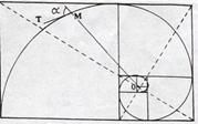 được một hình xoắn ốc, gọi là hình xoắn ốc Logarit. Trong tất cả những hình được gọi chung là hình xoắn ốc, thì hình xoắn ốc Logarit có đặc tính là dù ở gần tâm điểm hay vòng ra ngoài xa, hình dạng vẩn giữ nguyên. Tâm điểm này là điểm O, là điểm gặp nhau của những đường chéo góc của các hình kim nhật. Trên đường xoắn ốc Logarit, nếu ta lấy một điểm M bất kỳ nào và vẽ bán kính OM và tiếp tuyến MT với đường xoắn ốc, thì góc α (alpha) giữa OM và MT lúc nào cũng giử nguyên một trị số.