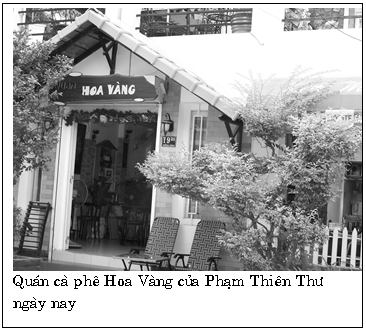 Chúng tôi ngừng xe ở gần góc đường Yên Đổ (VC đă đổi thành Lư Chính Thắng) và Hai Bà Trưng, dựng xe ở một gốc cây đầy hoa màu vàng, đă thấy Phạm Thiên Thư chạy ra tận cửa đón chúng tôi vào quán. Quán cà phê (không có tên) là một căn nhà nhỏ nằm quay mặt ra đường Yên Đổ gần phía hẻm Bến Tắm Ngựa; Phạm thuê của một bà Dược sĩ, nh́n vẻ tối tăm, nhếch nhác; lỏng chỏng mấy chiếc bàn thấp lè tè, bên trong quán chai lọ, b́nh rượu ngâm thuốc xếp lộn xộn trên kệ.