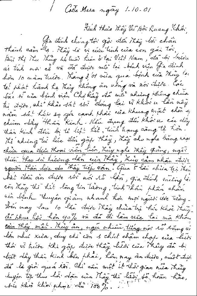Mỗi tuần, người bệnh cần liên lạc với tôi một lần để cho tôi biết những cảm nhận trong người và diễn tiến của bệnh để được chữa tiếp và hướng dẫn thêm..