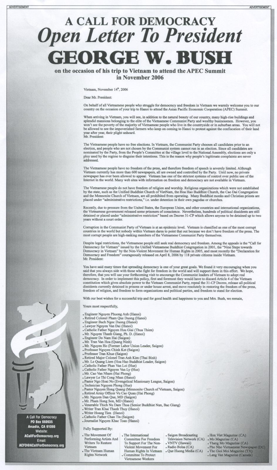 Nhật báo The Washington Post số ra ngày 14/11/2006, đă đăng bức Thư Ngỏ của 28 nhà Dân Chủ đang sống tại Việt Nam gửi Tổng thống Hoa Kỳ George W. Bush. |