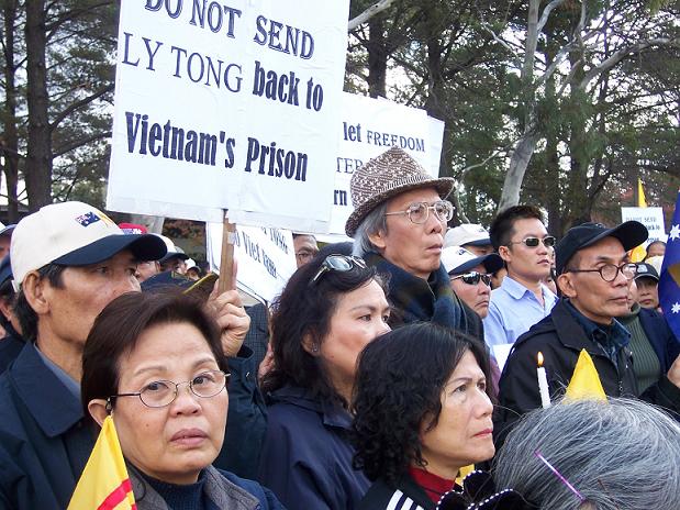 Dear friends, The Vietnamese Community in Australia organized a mass protest today in commemoration of April 30, 1975 by going to the Vietnam Embassy, then to the Thai Embassy, to seek the release of Vietnamese American Ly Tong, who was a pilot in the Air Force of the Republic of Vietnam's Black Eagle squadron. In April 1975, the last days before the fall of Saigon when the USA did not honor its promise to help South Vietnam under attack, Ly Tong was shot down by a Soviet anti-aircraft rocket while he was valiently flying an A-37 in combat. He was imprisoned in a concentration prison camp in North Vietnam (called a "re-education" camp) and escaped through Cambodia to Thailand, then to Singapore where he successfully petitioned the U.S. Embassy for political asylum. In becoming a Vietnamese American he earned a Master's Degree at the University of New Orleans. In 1984, he received a letter from President Ronald Reagan for his heroic escape for freedom. In 1992, Ly Tong hijacked a Vietnamese Airlines airliner and forced the pilot to fly over Saigon, whereupon he dropped anticommunist leaflets. Ly Tong then parachuted from the plane (no passengers or crew were endangered) whereupon he was captured by Vietnamese soldiers and sent to prison once again. He was released in an amnesty program in 1998, and returned to the U.S. In January, 2000 he rented a small plane in Florida and flew over Havana, dropping thousands of leaflets encouraging Cubans to overthrow the Communist dictatorship of Fidel Castro. He was greeted by a parade of Cuban Americans in Florida after this successful event, but his pilot's license was suspended. In November, 2000, Ly Tong hijacked a plane in Thailand, once again dropping leaflets over Saigon and not harming anyone. He was jailed in Thailand, who have now instituted proceedings to extradite him to Vietnam on May 17, 2006. He began a hunger strike in the Thai prison at Raydong on March 28, 2006. Ly Tong managed to get a note to the Vietnamese Diaspora via a prison guard with the information that he was to extradited and that the Thailand government had agreed on the charge of "violating Vietnamese air space." This resulted in the protest by 2500 people of the Vietnamese community in Australia today, April 30, 2006, seeking prison transfer for Ly Tong to the USA rather than trial and imprisonment in Vietnam. Background material in English is gathered from the following website: http://en.wikipedia.org/wiki/Ly_Tong There are links on Wikipedia (which is an Internet phenomenon of free and immediate publishing) to Vietnamese language sites and articles about Ly Tong. Thank you to Nguyen Chi Thien, the poet, who is in Canberra speaking and meeting with the Vietnamese community and is pictured in this photograph. Permission is granted to publish it by any media or individual who will honor the Republic of Vietnam (South Vietnam) on this commemorative day. Thank you, Vietnamese community in Australia for transmitting the photograph and the story for Viet-Am Review. You can ready the story and see the photograph at the Viet-Am Review blogsite, below.
