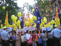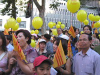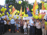 Với tiếng trống vang dội, những người biểu t́nh đă đưa cao biểu ngữ và hô lớn khẩu hiệu chế nhạo cái duyên dáng của đại nhạc hội này, số lượng đông đảo những người Việt Nam cư ngụ ở Canberra đă phản đối chống lại chuyến lưu diễn của hơn 90 nghệ sĩ từ Việt Nam.