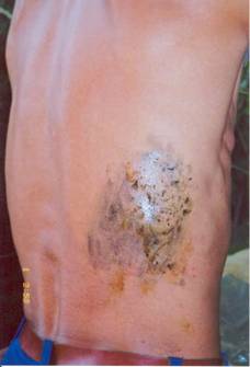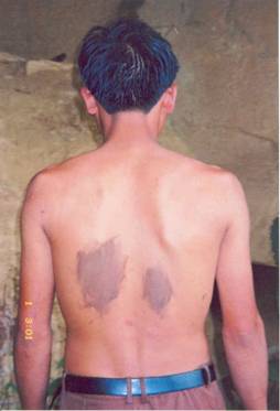 photograph shows deep bruising underneath his right shoulder blade.