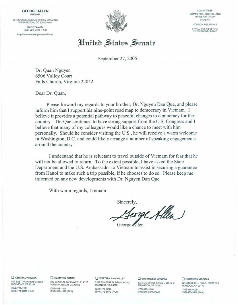 Qua văn thư chính thức đề ngày 27 tháng 9, 2005 gửi Bác Sĩ Nguyễn Quốc Quân, Chủ Tịch Ủy Ban Quốc Tế Yểm Trợ Cao Trào Nhân Bản, cũng là bào huynh của Bác Sĩ Nguyễn Đan Quế trong nước, Nghị Sĩ George Allen đă yêu cầu Bác Sĩ Qưân thông báo cho Bác Sĩ Quế biết rằng ông ủng hộ lộ tŕnh 9 điểm của Bác Sĩ Quế nhằm dân chủ hóa Việt Nam. Nghị Sĩ Allen nói rằng ông tin tưởng lộ tŕnh này có khả năng đưa tới việc thực hiện dân chủ tại Việt Nam một cách ôn ḥa. Nghị Sĩ Allen cũng cho biết Bác Sĩ Quế tiếp tục được sự hậu thuẫn mạnh mẽ tại Quốc Hội Hoa Kỳ, khiến ông tin tưởng nhiều đồng viện của ông muốn có cơ hội gặp Bác Sĩ Quế. Nghị Sĩ Allen hứa, trong trường hợp Bác Sĩ Quế nhận lời viếng thăm Hoa Kỳ, ông sẽ được đón tiếp nồng nhiệt tại Thủ Đô Hoa Kỳ, và có thể được mời nói chuyện khắp nước.