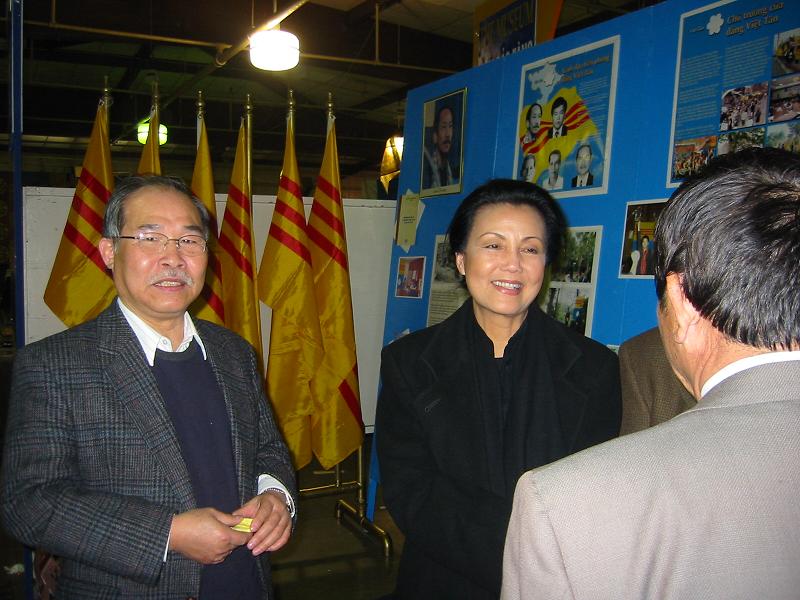 Nữ Diễn Viên Kiều Chinh trong gian hàng của Đảng Việt Tân tại hội chợ tết Ất Dậu 2005 tại San José với giàn cờ vàng lộng lẫy