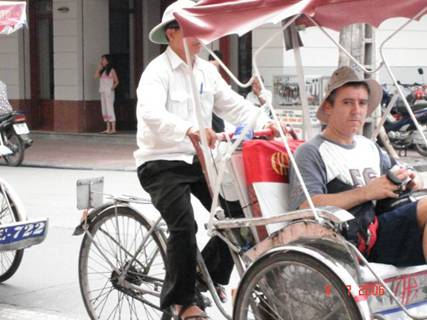 Ảnh 4: Khách du lịch phương Tây trên đường phố Hà nội, người dân Việt nam đạp xích lô để phục vụ khách du lịch phương Tây.