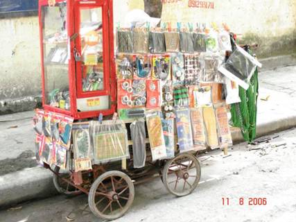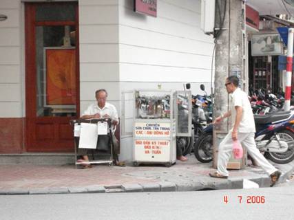Ảnh 5: Một người dân nghèo Việt nam đang ngồi bán vé sổ xố do nhà nước CSVN phát hành, ngay bên cạnh là một chiếc tủ của người thợ sửa chữa đồng hồ nghiệp dư ngay trên đường phố trung tâm thủ đô Hà nội.