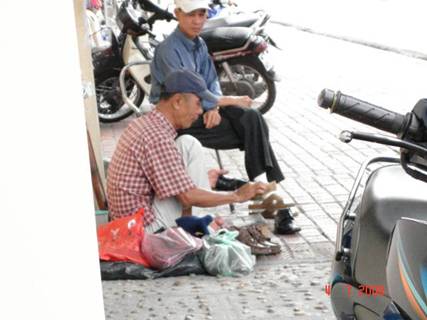 Ảnh 6: Một người dân nghèo Việt nam đang ngồi đánh giầy ngay trên đường phố trung tâm thủ đô Hà nội của nước CHXHCN VN, thủ đô được mệnh danh là “ngàn năm văn hiến”, rồi là “dân giầu, nước mạnh, xă hội dân chủ, công bằng, văn minh”!!!
