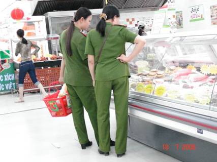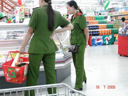 Ảnh 17: Hai học viên của trường cảnh sát cộng sản Việt nam đi mua sắm đồ ở siêu thị Bourbon hay c̣n gọi là Big-C, đây là một siêu thị rất lớn do tư bản Pháp đầu tư tại Hà nội. Mặc dù những học viên cảnh sát này được đào tạo về mặt lư thuyết theo chủ thuyết Mác-Lê tức là phủ nhận nền kinh tế thị trường, nhưng trên thực tế th́ họ lại làm ngược lại hoàn toàn!