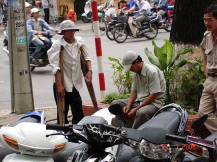 Ảnh 19: Một thanh niên tàn tật, hai tay đeo nạng, nhưng phải đứng ngoài đường phố để bán vé số do nhà nước CSVN phát hành để kiếm sống. Nhà nước CSVN không có đoái hoài đến những số phận người dân nghèo đói như vậy, quan chức của nhà nước CSVN c̣n đang mải ngự trên những chiếc xe hơi nhập khẩu sang trọng ở trên để vi vu đây đó cái gọi là "phục vụ nhân dân"!
