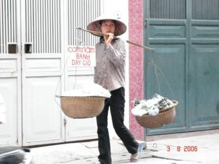 Ảnh 20: Một cô gái c̣n khá trẻ, có lẽ là ở nông thôn ra kiếm sống tại thành phố, nhưng đang phải gánh hàng bán quà sáng (cơm nắm, bánh dày gị) ngay trên các đường phố thủ đô Hà nội của nước CHXHCN VN!