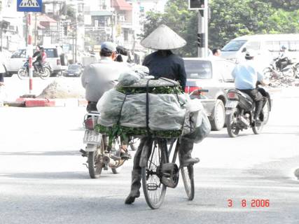 Ảnh 24: Một nông dân trồng rau đang đèo rau bằng xe đạp ra thành phố để tiêu thụ.