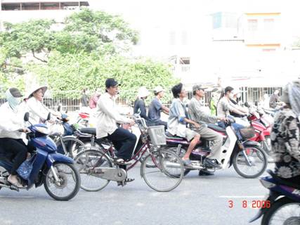 Ảnh 3: Tại một ngă tư trung tâm thủ đô Hà nội, người dân thường đi lại bằng xe gắn máy là chủ yếu ở xứ sở CHXHCN VN nghèo đói nhất thế giới, c̣n các quan chức CSVN đi lại bằng xe hơi sang trọng do các nước tư bản sản xuất.