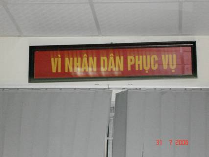 Ảnh 36: Khẩu hiệu "V́ Nhân Dân Phục Vụ" được treo đầy ở các công sở, cơ quan công quyền của nhà nước CSVN, nhưng ở ngay tại các cơ quan này, người dân không thấy được "đầy tớ trung thành phục vụ nhân dân", mà chỉ thấy những thái độ hành dân, hách dịch, hống hách, cửa quyền, coi người dân như cỏ rác của đám quan chức CSVN nhân danh "đầy tớ…"