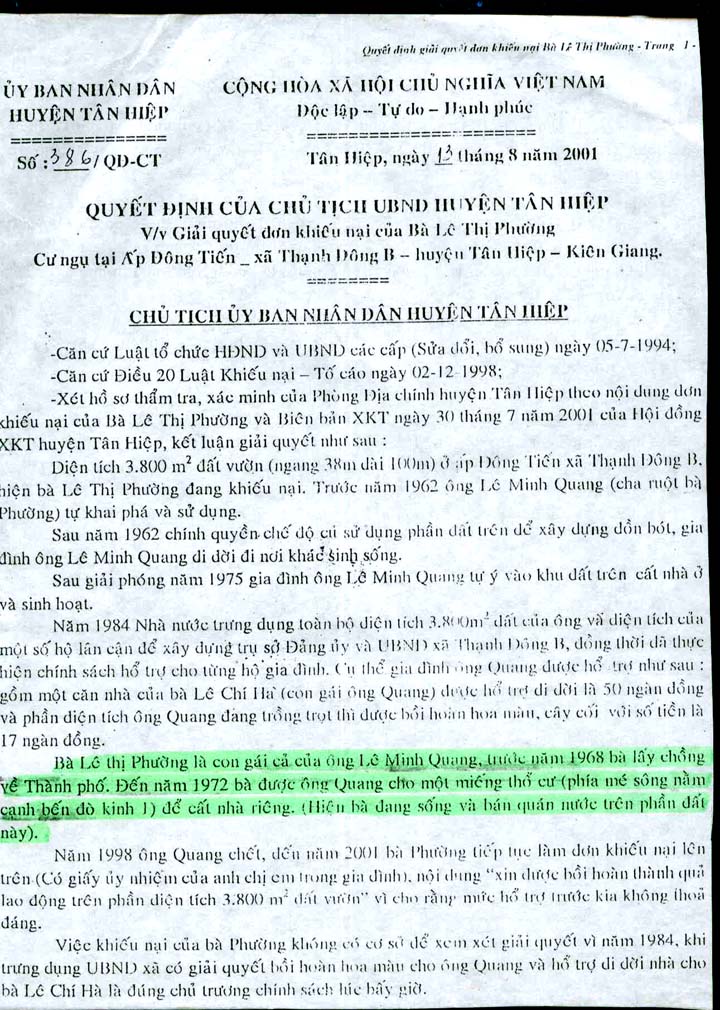 Chính quyết định số 360 / 1999 của UBND huyện là hiệu lệnh cho việc cướp đất của gia đ́nh chúng tôi đến tận cùng và không c̣n cho chổ để nưong thân …ngày 4/4/2001 thanh tra tỉnh ra quyết định số 54/QĐ-TTR với nội dung cũng tương tự của huyện , ngaỳ 13/8/2001 UBND huyện TânHiệp ra thêmquyết định số 386 /QĐ – CT , ngày 05/04/2004 ra thêm quyết định số 03/ QĐ/CT , ngày 02/08/ 2004 UBND HUYỆN Tân Hiệp ra quyết định số 751 / QĐ/CT ra quyết định cưởng chế , ngày 10/8/ 2004 công an xă và một tóan khỏang 40 người kéo đến tràn vào phá hết tường vách , dở nóc , cắt điện …..