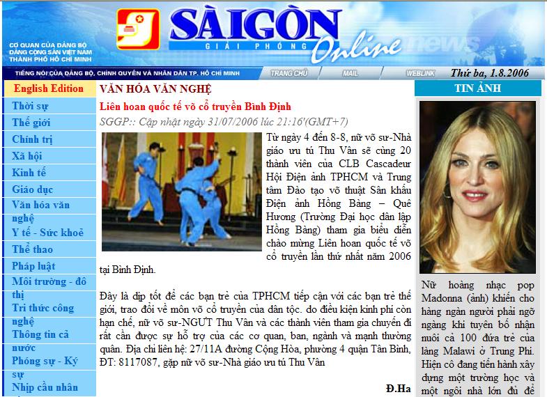 (Chú ý: hình trong bài báo có cờ vàng ba sọc đỏ. Xin kiểm chứng lại trong trang web của báo Sàigòn Giải Phóng http://www.sggp.org.vn/vanhoavannghe/2006/7/55498/ và riêng tấm hình này trên trang web Image Data của báo http://www.sggp.org.vn/dataimages/original/images125368_vo.jpg)