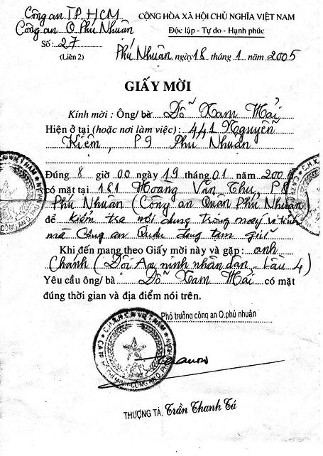 chiều tối ngày 18/1/2005, tôi có nhận được 1 Giấy Mời do thượng tá Trần