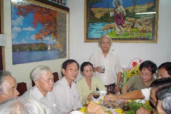 Sàig̣n – 6g00 chiều hôm qua (15-11-2005), tôi được cụ linh mục Chân Tín mời đến uống rượu với cụ, mừng sinh nhật thứ 86 của cụ. Cụ bảo chỉ có vài người thân tín thôi, và cùng uống rượu trong căn pḥng khoảng 16 mét vuông của cụ, là văn pḥng nơi cụ làm việc. Nhưng đến nơi, chúng tôi thấy có hai bàn tiệc, một trong pḥng cụ và một trong pḥng dạy giáo lư của cụ gần ngay đó, cũng chỉ bằng căn pḥng cụ, nhưng không có đồ đạc nên có vẻ rộng hơn. Linh mục Phạm Trung Thành, một linh mục trẻ cùng ḍng với cụ, bảo tôi: «Cụ chỉ dự định mời một vài người thân nhất đến chung vui với cụ thôi. Nhưng mấy linh mục trẻ trong ḍng cho rằng cụ sống thêm được tuổi nào th́ mừng và quư tuổi ấy, nên cần phải ăn mừng. Với tính khiêm nhường và tinh thần an bần lạc đạo, cụ chỉ chấp nhận cho các linh mục cùng ḍng làm 2 bàn tiệc để cụ có thể mời đông hơn một chút thôi”. Cũng ngày này năm ngoái, nhà ḍng đă tổ chức khá lớn để mừng cụ được 85 tuổi và được 60 năm khấn ḍng, nên mời khoảng 100 người, tôi cũng được mời đến tham dự. Năm nay, số người đến dự tiệc chung vui với cụ chỉ được khoảng 20 người. Đương nhiên số người chỉ đến ngỏ lời chúc mừng cụ th́ lớn hơn rất nhiều.