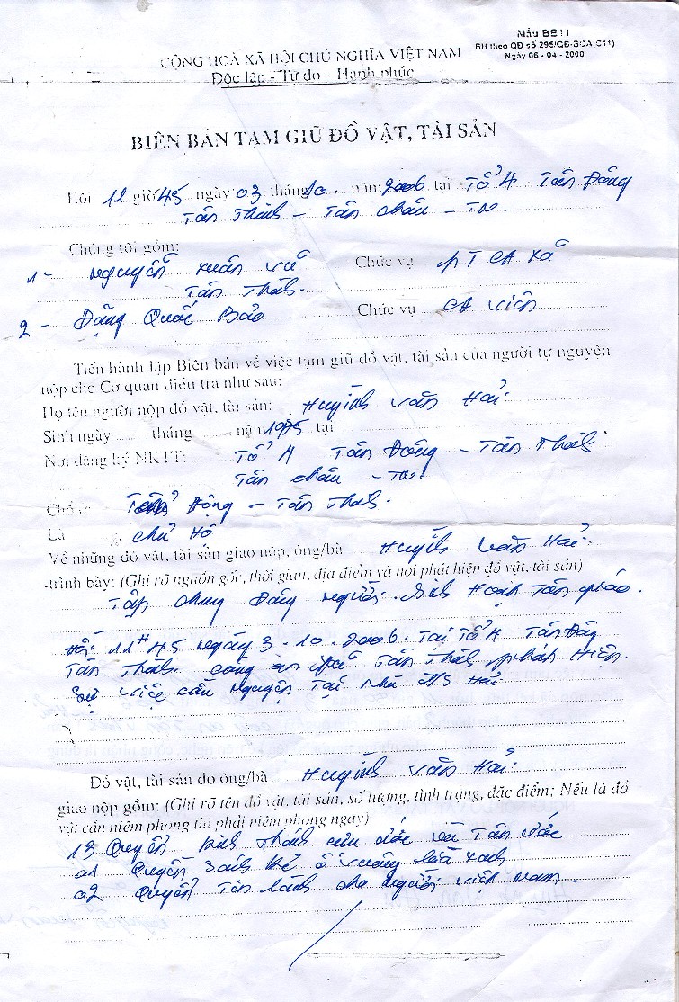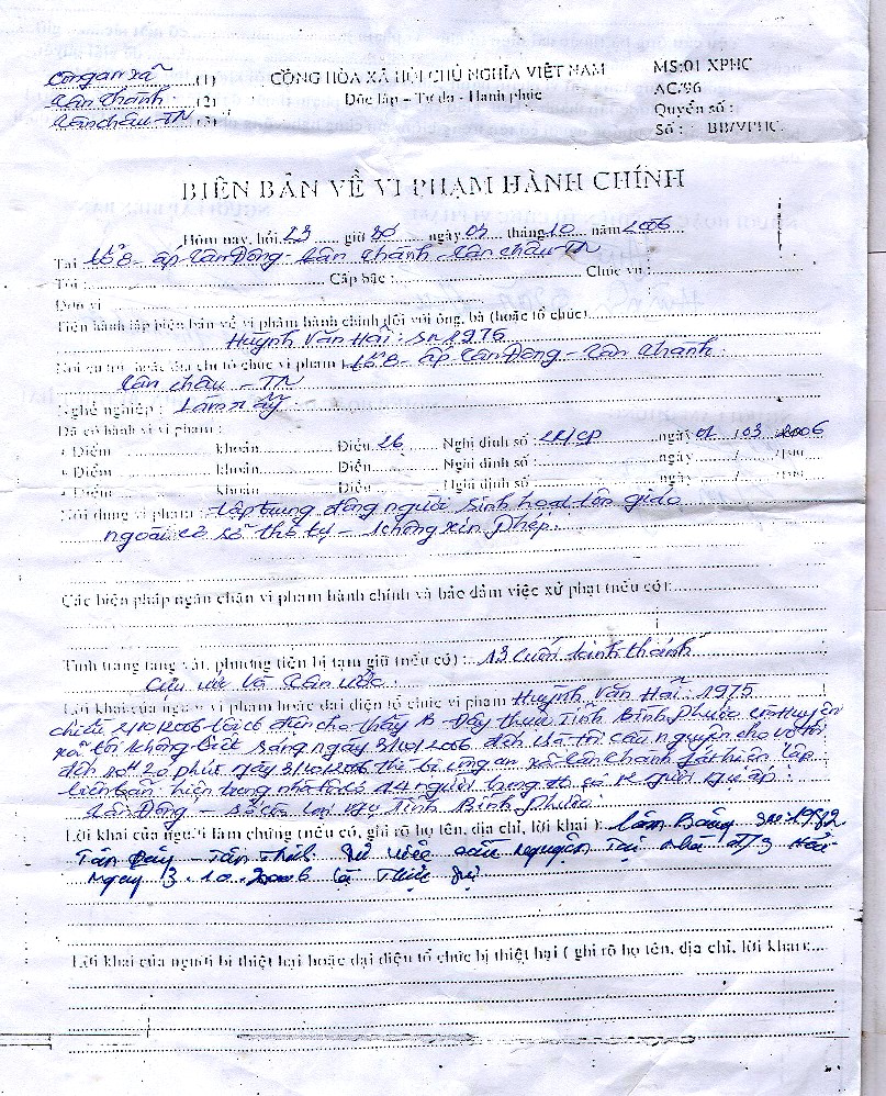 Hôm nay vào lúc 10 giờ 00 ngày 03/10/2006 tại ấp Tân Đông – xă Tân Thành - huyện Tân Châu - Tỉnh Tây Ninh. Đang khi các Tín Hữu nơi đây đang co buổi hiệp nguyện như thường lệ th́ 4 người đại diện cho chính quyền trong đó có :