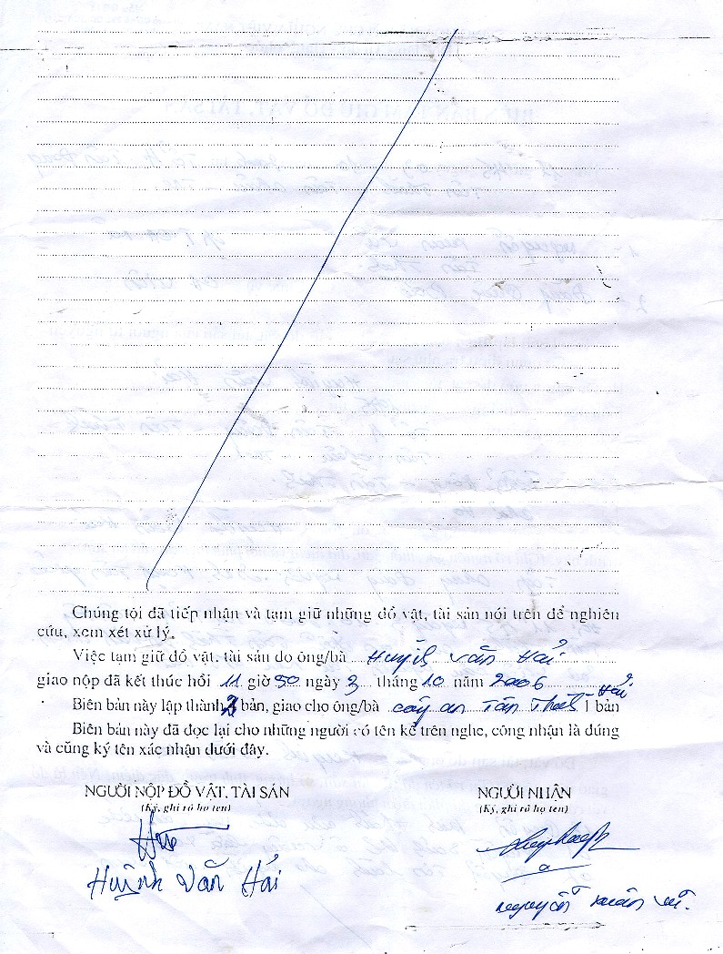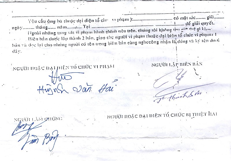 Công an đă vào nhà và hô to : “ Mọi người ai ngồi yên đó, cấm không được rời khỏi chổ ngồi, nếu tự động đứng lên và rời khỏi chổ cách tuỳ tiện, th́ có ǵ xảy ra th́ chúng tôi không chịu trách nhiệm!”. Với khẩu khí như vậy th́ người dân quê nơi đây phải run sợ trước bạo quyền của những người được gọi là “ Đầy tớ của nhân dân!”. Bên cạnh đó họ buộc các Tín Hữu để yên các quyển Kinh Thánh tại chổ và họ tiến hành lập biên bản về vi phạm hành chánh ( không số) và một biên bản thu giữ đồ vật và tài sản của các Tín Hữu.