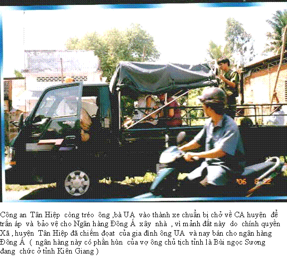đến th́ có một số công an xă bắt cháu chở thẳng lên công an huyện Tân Hiệp bỏ cháu vào một căn pḥng tại công an huyện , rồi tất cả CA bỏ về bắt cháu phải ngồi tại chổ và bỏ đói cháu không cho ăn cơm trưa và không cho nước uống !!! đến gần 14 g các công an mới lại hỏi rằng “ có phải bà UA thuê mầy chọi đá vào công nhân đang xây dựng công tŕnh cho Ngân Hàng Đông Á không ? ....” cháu Việt trả lời rằng đâu có ai thuê tôi đâu , tôi đâu có chọi đá vào bao giờ . Theo lời cháu kể :Các công an c̣n đe dọa nếu không thừa nhận th́ sẽ giam và tiếp tục bỏ đói , nói xong các công an viết ǵ đó trong 1 tờ giấy nếu mầy hứa không chọi phá th́ tao thả mầy ra , rồi bắt cháu kư vào ???.......