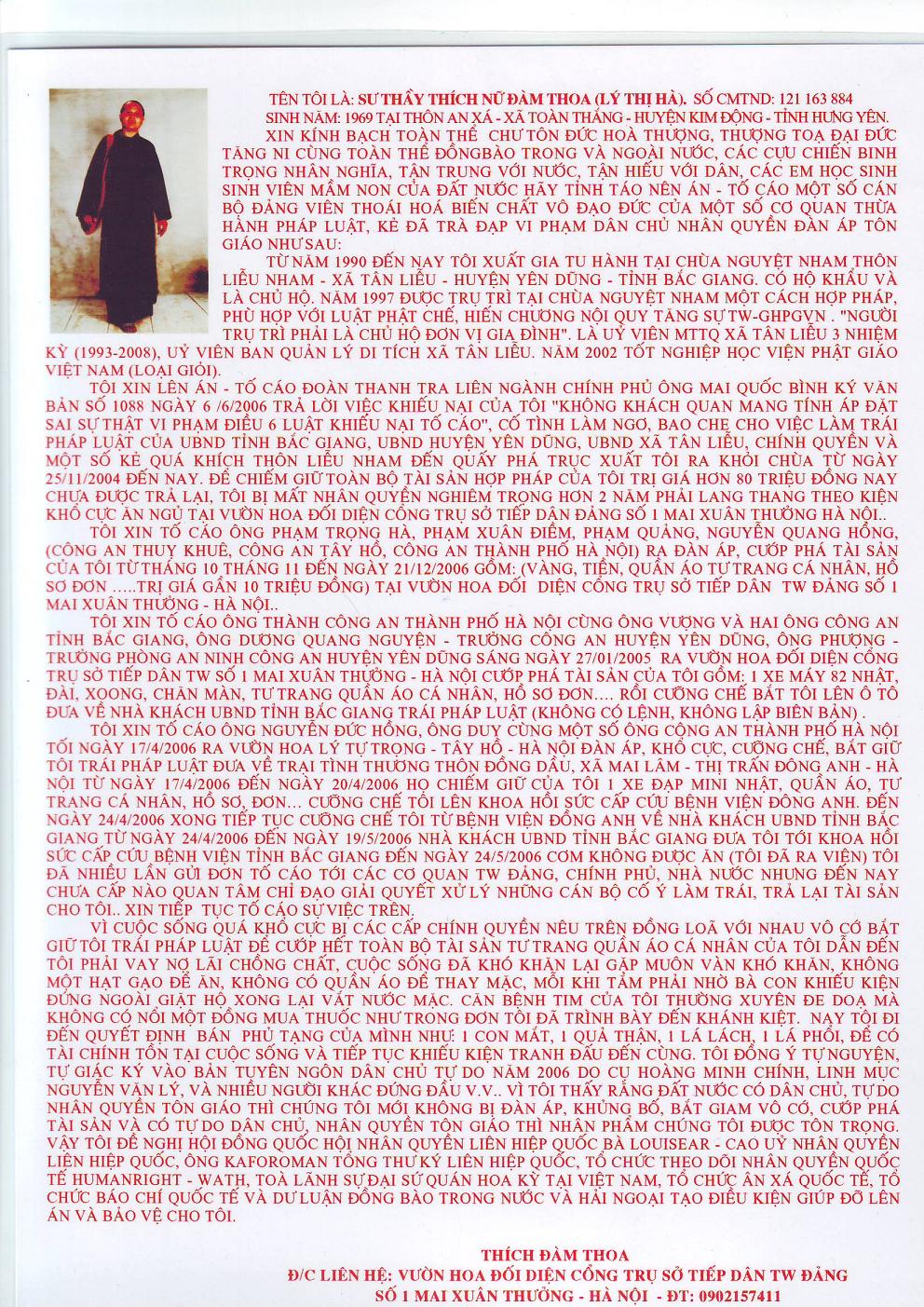 Vậy tôi viết những ḍng chữ này gửi tới chư quư vị và rất mong quư vị tạo điều kiện giúp đỡ tôi được đi lưu vong chính trị tại Hoa Kỳ và xin được hoạt động tôn giáo tại giáo hội phật giáo Việt Nam thống nhất. Nếu quư vị không đồng t́nh tôi sẽ tới cổng nhà Thủ tướng ngồi thiền, tuyệt thực, tự thiêu.