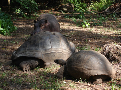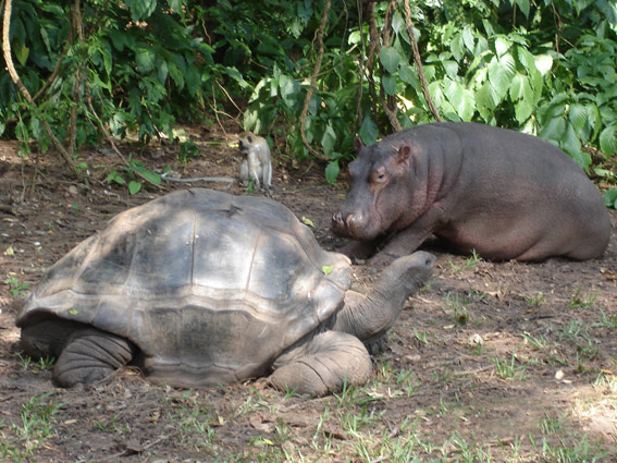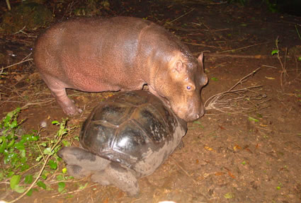 On Tuesday I went back with camera this time and watchd them but they were both lying about just a few feet from me. Then I heard a strange sound, like a high pitched but soft whine. It was coming from Owen, and then as I listened, it was coming from Mzee. I couldn't believe my ears, they were making sounds to one another. But they were not typical hippo or tortoise sounds. I think one of them is copying the other but which one is doing it is the question. In an elephant orphanage in Kenya the baby elephants mimic the sounds of cars on a near by highway. Maybe Owen is mimicking the sounds of the air in Mzee's stomach. Whichever it is, it's pretty extraordinary. What do you think is going on?