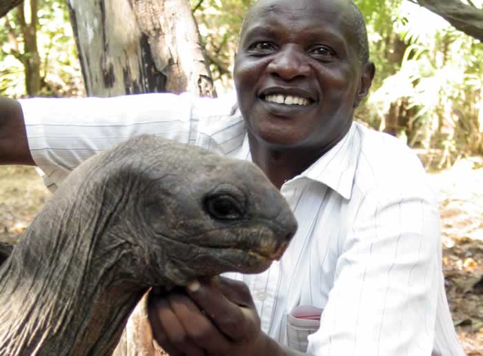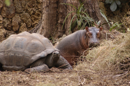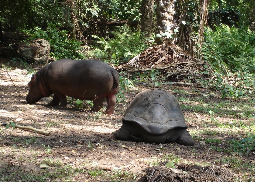 Later on, particularly around 5.00 p.m., he tends to hang out with the smaller tortoise in his enclosure. This time of day coincides with when he is normally fed. After being fed he then seeks out Mzee, who has recently taken to being in the background, looking for grass and other plants deeper in the enclosure.
