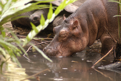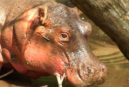 Today Owen was resting out on the ground with Mzee and relaxing in the puddles and mud. Not much was happening, and the whole forest was still as it usually becomes after it rains. Owen is definitely getting bigger by the day. Male hippos tend to be bigger than the female hippos. When looking at him and at Cleo (Cleo was pictured 06/10/05) it becomes easier to imagine that one day he may be as big as, or even bigger than Cleo. I really hope that they will get on.